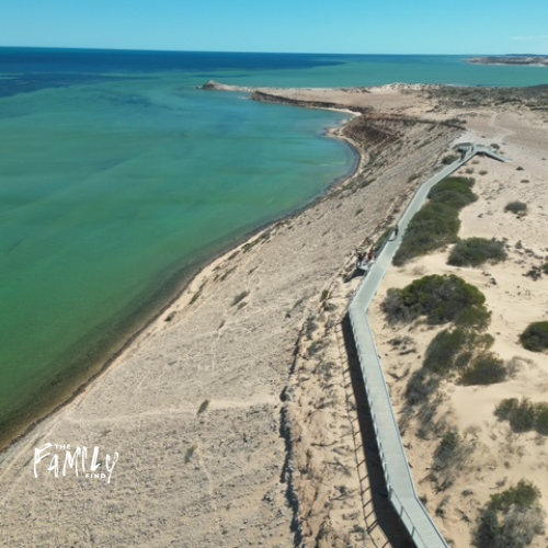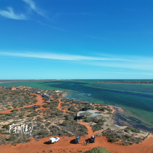 Next stop was Eagle Bluff Lookout, and wow — what a view. A short boardwalk leads you along the cliff edge, with sweeping panoramas over Shark Bay’s turquoise shallows. From above, we spotted several sharks gliding through the water beneath us, which had the kids (and us adults, let’s be honest) absolutely buzzing.